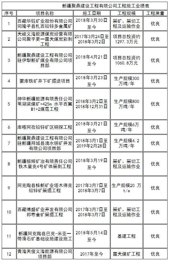 新疆聚鼎建設(shè)工程有限公司為國(guó)家礦山工程總承包二級(jí)企業(yè),創(chuàng)建于2013年,主要從事礦山采掘、隧道開挖、大型土石方爆破、機(jī)電設(shè)備安裝,水利水電工程,路橋工程等工程施工。